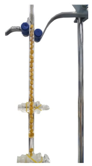 General methods of solid volume measurement include the sand discharge method and drainage method. These conventional methods are less effective because the volume of individual grains is too small, the accuracy of the measuring cylinder is not high, and water bubbles will be attached to the surface of the grains. This experiment used a high-precision burette as a volumetric measuring device (Figure 9), in which water was replaced with alcohol to reduce the air bubbles adhering to the surface of the grains. We divided 100 grains into 10 groups and took readings for each of the sunken 10 grains to obtain the total volume of the 10 grains.
