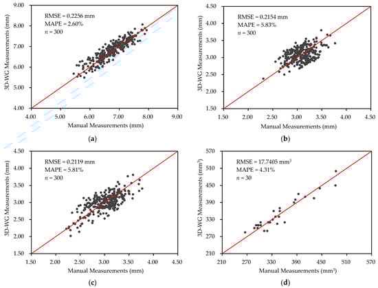 The root mean square error (RMSE) and mean absolute percentage error (MAPE) were used to evaluate the WG-3D measurement accuracy. The formulae are as follows: