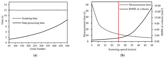 Measurement efficiency: (a) measurement time consumption for different numbers of grains; (b) relationship between scanning speed and measurement time and RMSE of volume. The red line is selected reference line.