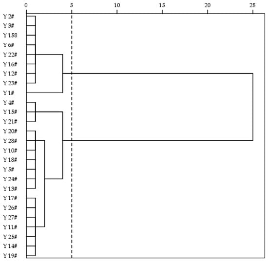 Based on the rapid batch measurement of grain 3D morphology, the 3D morphological traits such as length, width, thickness, and volume were used as cluster analysis variables for the stratified clustering of Yangmai series varieties. As shown in Table 5 and Figure 12, the differences in grain 3D morphology were small, and the Yangmai series varieties could be classified into two classes at the genetic distance of 5-level. The first category is dominated by small-grain wheat, with the volume generally not exceeding 35 mm3, including Y 1#, Y 2#, Y 3#, Y 6#, Y 12#, Y 16#, Y 22#, Y 23#, and Y 158. The second category was dominated by large-grain wheat with a volume of more than 35 mm3 and included Y 4#, Y 5#, Y 10#, Y 11#, Y 13#, Y 14#, Y 15#, Y 17#, Y 18#, Y 19#, Y 20#, Y 21#, Y 24#, Y 25#, Y 26#, Y 27#, and Y 28#. Zhang et al. [] clustered the Yangmai series varieties into two categories using different quality traits as variables, which was supported by the results of genealogical analysis. The results of the present study are similar to their findings, such as Y 158 being the genetic basis of the strong-gluten and small-grain varieties of Yangmai, Y 23# being inherited from Y 16#, and Y 16# being inherited from Y 158 superior line Yang91F138. Yang80Jian3 and Ningmai No.9 are the genetic basis of the weak-gluten and large-grain varieties of Yangmai, Y 15# is inherited from Yang 89-40, and Yang 89-40 is inherited from Yang80Jian3; Y 20# and Y 13# are also inherited from Yang80Jian3; Y 18# and Y 21# are inherited from Ningmai No.9.