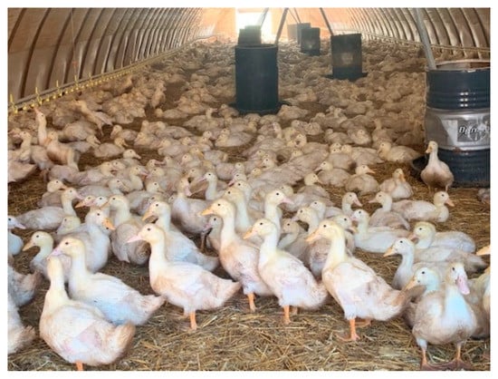 Cherry Valley ducks are fattened on the poultry farm where our research took place. The Cherry Valley duck is a commercial cross of Pekin ducks and it is one of the major duck crosses used for commercial duck meat production in Hungary. It has a high growth rate and reaches a market live weight of 3.45 kg at 42 days of age with a FCR of 1.92 in the case of a medium-sized commercial duck (Figure 1). In one period, 8000 ducks are fattened, housed in one building from one day old to two weeks old, and then the ducks are divided into four buildings. Thus, 2000 ducks are fattened in one building until the end of the seven-week fattening period.