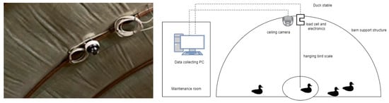 The EU produces approximately 90% of the world’s foie gras. The other main producing countries are China, the United States, and Canada. Approximately 117,979 tons of foie gras were produced in the European Union in 2021. The largest populations of waterfowl are in France and Hungary (68.6 and 20%, respectively) []. The bird flu outbreaks in recent years have caused serious economic damage to waterfowl farmers. The reason is that traditionally, waterfowl are reared in semi-free or free-range systems. Poultry reared in this way are at increased risk of infection with avian influenza. The loss of production caused by such an epidemic is a serious economic loss for farmers, and therefore confinement techniques are increasingly used. Large-scale, commercial waterfowl farming technology is mostly similar to that used for broiler chicken houses. Thousands of birds are kept in closed buildings under automated and controlled housing conditions. The Hungarian poultry sector is characterized by integrated production. The integrator company provides the farmer with the day-old ducks, the feed, and the advisory service. The company delivers the animals for slaughter according to an integrator contract with the producer at the contractually agreed price. The maximum mortality rate and the expected average weight of the slaughtered animals are fixed in the contract []. In practice, the integrator’s consultants check the weight of the birds once during the production period by representative manual weighing (10–15 ducks per weighing). The cooperation with the integrator creates a predictable framework for duck farmers, and the right quality of carcass is the interest of both the integrator company and the duck farmer. Optimizing the number of inputs used (feed, drinking water, energy, litter, medicine, human resources) and minimizing mortality and animal health risk is in the interest of the farmer. This includes automating keeping technology, making high use of existing equipment, and increasing the speed of production rotation (shortening the length of service periods). The more efficiently the farmer produces ducks, the more profitable is his business. Poultry weight provides information about growth and the feed conversion efficiency of the flock can be calculated. Whether the aim is fattening or liver production, the weight and health of the ducks and geese are equally important indicators for farmers. In large-scale poultry production, weight monitoring of the birds is carried out either manually at some points a couple of times during the rearing period or by using digital scales placed among the birds in the building. In both cases, the average of the individual weight measurements of a small proportion of the flock is used to determine the average weight of the whole flock. When many birds need to be weighed, the traditional method is labor intensive and time-consuming [], stressful to birds [,], subject to transcription errors, and prone to human errors []. It might be useful to automatically collect simultaneous information about the growth trend of all the birds to identify deviations from the expected growth trend [,], having also details about the health and welfare status of the animals [].