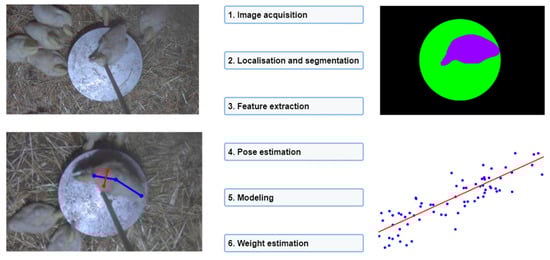 The multi-stage processing pipeline was built up in the following way: the first step was to acquire the camera images (step 1), then segment the images using the instance segmentation neural network (step 2), which located the bird in the image and created a mask for it. If the network recognized a duck on the scale with at least 80% surety, the next step was the pose estimation and computation of the features (step 3) used in the weight estimation: the mask area and the ellipse area fitted to the mask. These two main features were passed to the weight estimator, and further two features were calculated: wingtip length and spine length (step 4). As a last step, the weight of the duck seen by the camera was estimated by the used model (steps 5 and 6) (Figure 6).