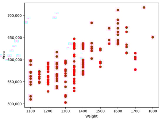 Figure 8 shows the 50 g class data (the y-axis shows the area counted from the mask and the x-axis shows the weight data sent by the scale) and the distribution of the area occupied by the birds on the image.