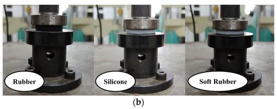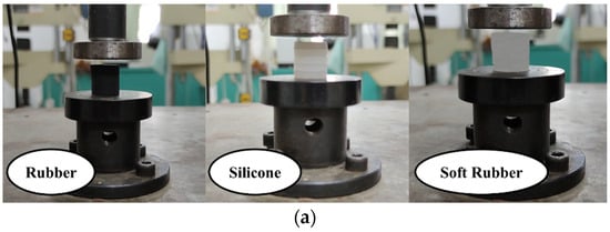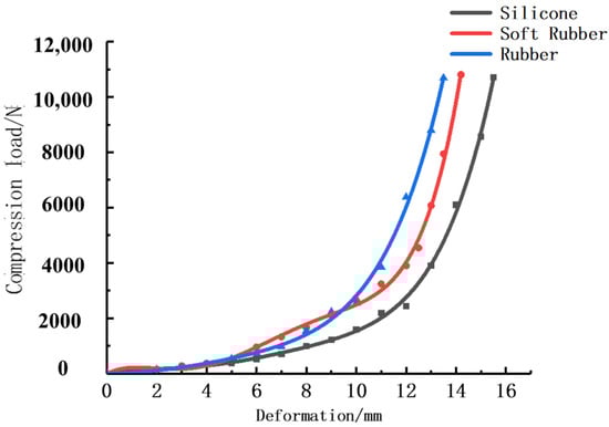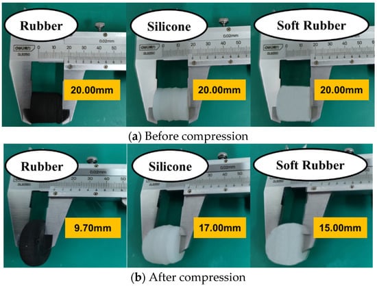 In order to measure the parameters of rubber, soft rubber and silica gel, they were made into φ20 mm × 20 mm cylindrical samples, which were tested on electronic universal testing machine DDL10 (range 0–10 kn; Changchun Institute of Mechanical Science Co., Ltd., Changchun, China) and conducted a uniaxial compression experiment (Figure 1), using the speed control mode, adjusting the gap preload to 0.001 KN, adjusting the gap speed to 1 mm/min and pulling and pressing speed to 10 mm/min. In order to ensure the validity of the experimental data, each material is made into three samples, which are tested separately and the obtained parameters are shown in Figure 1 below: