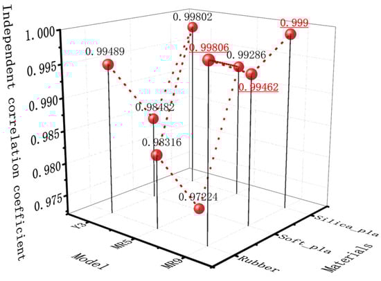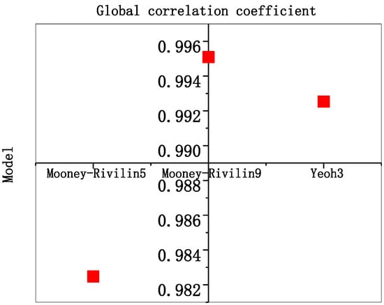 The experimental data obtained are processed by Origin and the results are shown in Figure 3 and Figure 4. According to Figure 3, the Mooney–Rivilin9 model has the highest global correlation coefficient, so the Mooney–Rivilin9 model is selected. According to the independent correlation coefficient in Figure 4, it can be seen that the performance of silica gel under Mooney–Rivilin9 model is the best and the corresponding parameter results are as follows: