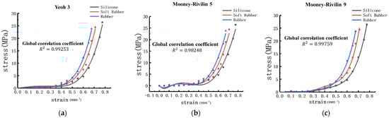 Stress–strain fitting curves of three models: (a) Yeoh3; (b) Mooney–Rivilin5; (c) Mooney–Rivilin9.