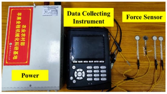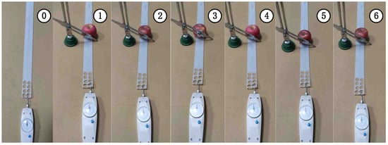 The steps are as follows: Cut the silica gel into 500 mm × 50 mm strips with a thickness of 10 mm and spread them on the experimental platform. (1) Drag the sample to slide on the experimental platform with a tension meter, record the number of the tension meter in Table 2 at no load, obtain the sliding dynamic friction force of the sample on the experimental platform and repeat the test six times; (2) prepare five Fuji apples for experiment, label the experimental apples and measure their weights. Put the apple on the surface of the silica gel sample and place a baffle in the middle and upper part of the apple to prevent the apple from following the movement of the silica gel sample. When ready, drag the silica gel sample to slide on the experimental platform with a tension meter and record the number of the tension meter in Table 2 to obtain the total sliding friction of the silica gel sample on the apple surface and the experimental platform. Repeat the experiment six times.