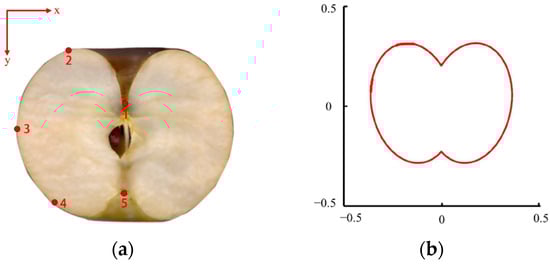 The conic curve can fit the shape of apple and then the apple can be fitted by the second-order equation modeling analysis and five representative points are selected on the front view of apple. Read out the values of five coordinates in AdobePhotoshop (2020, Adobe Systems Software Ireland Ltd, California, USA) and write a program in MATLABR2014b (MathWorks.Inc, Natick, MA, USA) to fit the apple conic of five points, as shown in Figure 10.