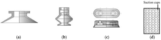 According to the adsorption function and application occasions, the new suction cups currently in use are mainly divided into four types: flat type, bellows type, elliptical type and honeycomb type [27], as shown in Table 3 and Figure 15.