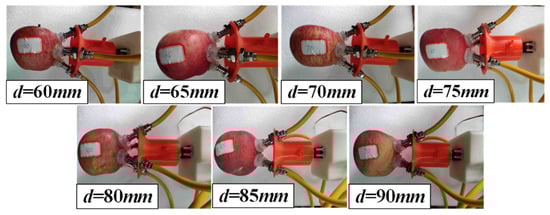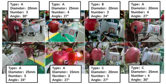 The validation test was conducted with four suction cups, suction cup size of 25 mm, suction cup angle of 27.1° and apple-growth attitude of 2 (A), as shown in Figure 29. The success rate was 100% and the relative deviation from the model prediction was 0.184%. The results showed that the combination of four suction cups, 25 mm suction cup size, 27.323° suction cup angle and 2 (A) apple-growth attitude was the optimal combination, with the highest picking success rate in the validation test.