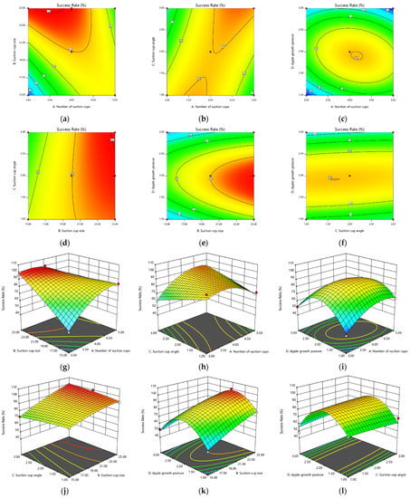 The interactions between the number of suction cups, suction cup diameter, suction cup angle and apple growth posture: (a–f) 2D contours; (g–l) 3D surface plots.