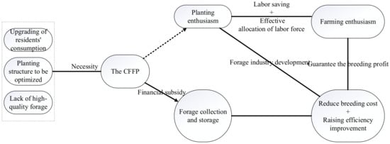 As the constraints on the development of herbivorous livestock husbandry in traditional pasture areas increase, the development of modern livestock husbandry also places new requirements on the structure and mode of herbivorous livestock husbandry. CFFP, as an important measure to adjust structure and change mode and promote structural reform on the supply side of agriculture in China, aims to play a leading role in financial funds, mobilizing farmers’ enthusiasm for forage cultivation through market mechanisms, building a new agricultural and livestock husbandry structure combining farming and raising animals, and promoting the development of herbivorous livestock husbandry (the policy implementation framework is shown in Figure 1). In 2015, the central government allocated special funds to begin the policy in 30 counties in the 10 regions of Liaoning, Heilongjiang, Jilin, Inner Mongolia, Hebei, Shanxi, Gansu, Qinghai, and Ningxia; at present, the policy has been implemented in more than 900 counties.
