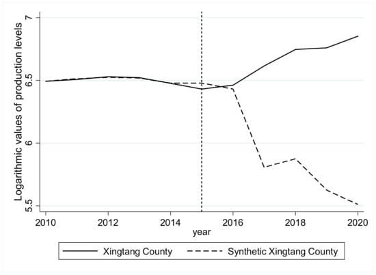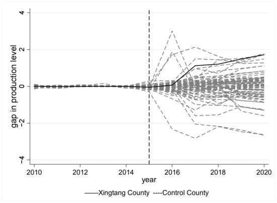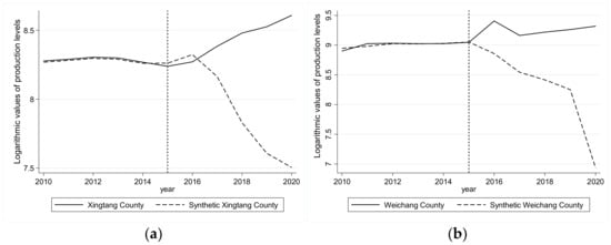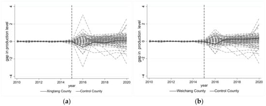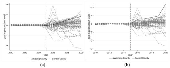 Figure 2 illustrates the fitting of the production level of herbivorous animal husbandry in actual pilot counties and artificial pilot counties from 2010 to 2020. The CFFP’s implementation year is indicated by the location of the vertical dotted line. From Figure 2a, it can be seen that before the policy implementation, synthetic Xingtang County and Xingtang County were very close in the change trend, indicating that synthetic Xingtang County better fit the change trend of the herbivorous livestock production level in Xingtang County; after the policy implementation, the herbivorous livestock production level in Xingtang County was higher than synthetic Xingtang County, and the difference between the two represents the policy effect, indicating that the implementation of the CFFP promoted the herbivorous livestock production level in Xingtang County. Similarly, as can be seen from Figure 2b, the fitted polder counties better fit the trend of the actual polder counties, and the difference between the trend of the actual polder counties and the synthetic polder counties since the year of policy implementation was positive, indicating that the CFFP implementation had the same positive effect on the improvement of the level of herbivorous livestock production in polder counties. Whether the level of herbivorous livestock production in Xingtang or Weichang counties was used as a predictor variable, the policy had a catalytic effect on the level of herbivorous livestock production in the pilot counties.
