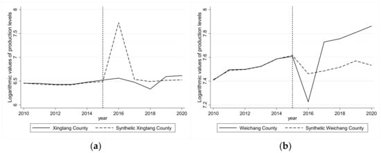 Effect of the CFFP on the production level of sheep industry, (a) the trend of Xingtang County and synthetic Xingtang County; (b) the trend of Weichang County and synthetic Weichang County.