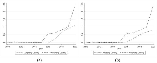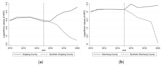 Effect of the CFFP on the herbivorous livestock production concentration index (HPCI), (a) the trend of Xingtang County and synthetic Xingtang County; (b) the trend of Weichang County and synthetic Weichang County.