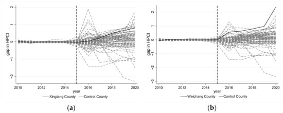 Similarly, according to Figure 7b, Figure 8, Figure 9 and Figure 10, the probabilities that the same situation as that in treatment group will occur in other control group areas are 7/74 (9.46%), 1/71 (1.39%), 25/65 (38.46%), 0/75 (0%), 0/75 (0%), and 16/75 (24%), when the HPCI in Xingtang County, the production level of cattle livestock in Xingtang County, the level of sheep livestock in Xingtang County, the production level of herbivorous livestock in Weichang County, the HPCI in Weichang County, and the HPCI in Weichang County are used as predictor variables, respectively. This suggests that the policy effects assessed using the synthetic control method are likely to be robust.