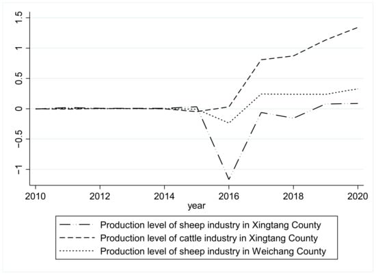 At the same time, the study further analysis of the policy effects of different livestock production levels in the pilot counties, and the results are shown in Figure 11. The study found that the CFFP implementation showed a positive effect on the pilot counties’ cattle industry production levels, but the positive effect on the pilot counties’ sheep industry production levels was not satisfactory, especially in Xingtang County. After five years of CFFP implementation, the improvement of regional sheep industry production levels was very limited. One of the reasons is that the development of regional industries is influenced by regional industries base, the economy, and policies [36,37]. For example, the dairy and beef cattle industries have been the key industries in the development of animal husbandry in Xingtang County, which has made an important contribution to the regional economic development and farmers’ income; the regional government has purposely tilted the use of policy funds toward the project areas where the dairy and beef cattle industries are concentrated, aiming to promote forage cultivation and the herbivorous livestock industry in the region. Support for the sheep industry is neglected or even squeezed due to limited policy resources.