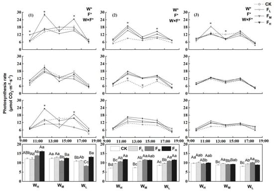 Changes in Pn values of test plant species under different water–fertilizer treatments. Numbers (1)−(3) in brackets indicate P. crymophila, F. coelestis, and S. purpurea, respectively. W, F, and W×F indicate the results of ANOVAs (p < 0.05) for the effects of water, fertilizer, and their interactions. Asterisk (*) and ns indicate significant difference and non-significant. The uppercase letters and lowercase letters represent the difference between water and fertilizer treatments.
