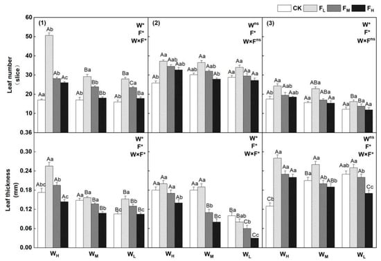 Changes in leaf number and leaf thickness values of test plant species under different water–fertilizer treatments. Numbers (1)−(3) in brackets indicate P. crymophila, F. coelestis, and S. purpurea, respectively. W, F, and W×F indicate the results of ANOVAs (p < 0.05) for the effects of water, fertilizer, and their interactions. Asterisk (*) and ns indicate significant difference and non-significant. The uppercase letters and lowercase letters represent the difference between water and fertilizer treatments.