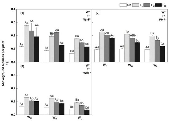 Changes in aboveground biomass values of test plant species under different water–fertilizer treatments. Numbers (1)−(3) in brackets indicate P. crymophila, F. coelestis, and S. purpurea, respectively. W, F, and W×F indicate the results of ANOVAs (p < 0.05) for the effects of water, fertilizer, and their interactions. Asterisk (*) and ns indicate significant difference and non-significant. The uppercase letters and lowercase letters represent the difference between water and fertilizer treatments.