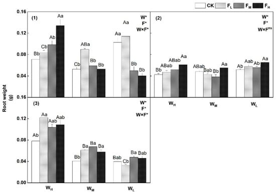Changes in root weight values of test plant species under different water–fertilizer treatments. Numbers (1)−(3) in brackets indicate P. crymophila, F. coelestis, and S. purpurea, respectively. W, F, and W×F indicate the results of ANOVAs (p < 0.05) for the effects of water, fertilizer, and their interactions. Asterisk (*) and ns indicate significant difference and non-significant. The uppercase letters and lowercase letters represent the difference between water and fertilizer treatments.