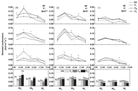 Changes in Gs values of test plant species under different water–fertilizer treatments. Numbers (1)−(3) in brackets indicate P. crymophila, F. coelestis, and S. purpurea, respectively. W, F, and W×F indicate the results of ANOVAs (p < 0.05) for the effects of water, fertilizer, and their interactions. Asterisk (*) and ns indicate significant difference and non-significant. The uppercase letters and lowercase letters represent the difference between water and fertilizer treatments.