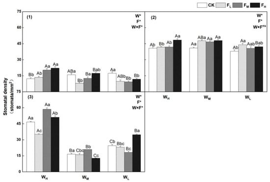 Changes in stomatal frequency values of test plant species under different water–fertilizer treatments. Numbers (1)−(3) in brackets indicate P. crymophila, F. coelestis, and S. purpurea, respectively. W, F, and W×F indicate the results of ANOVAs (p < 0.05) for the effects of water, fertilizer, and their interactions. Asterisk (*) and ns indicate significant difference and non-significant. The uppercase letters and lowercase letters represent the difference between water and fertilizer treatments.