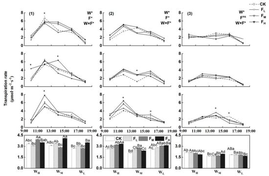 Changes in Tr values of test plant species under different water–fertilizer treatments. Numbers (1)−(3) in brackets indicate P. crymophila, F. coelestis, and S. purpurea, respectively. W, F, and W×F indicate the results of ANOVAs (p < 0.05) for the effects of water, fertilizer, and their interactions. Asterisk (*) and ns indicate significant difference and non-significant. The uppercase letters and lowercase letters represent the difference between water and fertilizer treatments. F. coelestis, and S. purpurea were significantly different (p < 0.05).