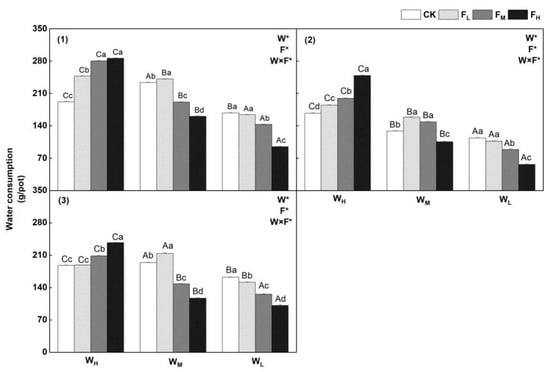 Changes in water consumption values of test plant species under different water–fertilizer treatments. Numbers (1)−(3) in brackets indicate P. crymophila, F. coelestis, and S. purpurea, respectively. W, F, and W×F indicate the results of ANOVAs (p < 0.05) for the effects of water, fertilizer, and their interactions. Asterisk (*) and ns indicate significant difference and non-significant. The uppercase letters and lowercase letters represent the difference between water and fertilizer treatments.