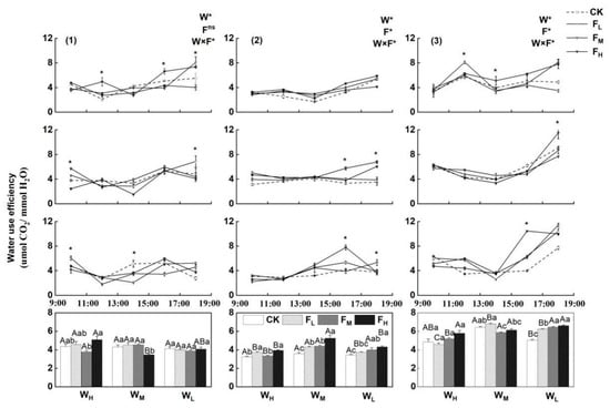 Changes in WUE values of test plant species under different water–fertilizer treatments. Numbers (1)−(3) in brackets indicate P. crymophila, F. coelestis, and S. purpurea, respectively. W, F, and W×F indicate the results of ANOVAs (p < 0.05) for the effects of water, fertilizer, and their interactions. Asterisk (*) and ns indicate significant difference and non-significant. The uppercase letters and lowercase letters represent the difference between water and fertilizer treatments.