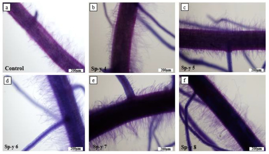 Effects of S. yanoikuyae SJTF8 at different CFU/mL concentrations on development of root hairs of 10-day-old rice seedlings. We stained the rootlets of the seedlings to make the root hairs visible. (a) Root hairs of 10-day-old seedlings under control. (b) Treatment effect showing visible increase in the root hair of seedlings treated with SP-y 4; (c) Treatment effect showing an increase in the density of root hair seedlings treated with SP-y 5; (d) Treatment effect showing a notable increase in the root hair length of seedlings treated with SP-y 6; (e) Visual observation of the root hair of rice seedlings treated with SP-y 7; (f) The root hair of rice seedlings treated with SP-y 8.
