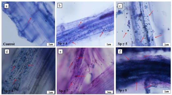 Microscopic images of root tissues of rice seedlings revealing presence of bacteria cells. (a) The root tissue of 10-day-old seedlings under the control treatment. (b) Visible presence of bacteria present in the root tissue of rice seedlings treated with SP-y 4; (c) Bacteria present in the root tissue of seedlings treated with SP-y 5; (d) Rice seedlings treated with SP-y 6 with high presence of the bacteria in the root tissue; (e) Root tissue of rice seedlings treated with SP-y 7; (f) Bacteria present in seedlings treated with SP-y 8.