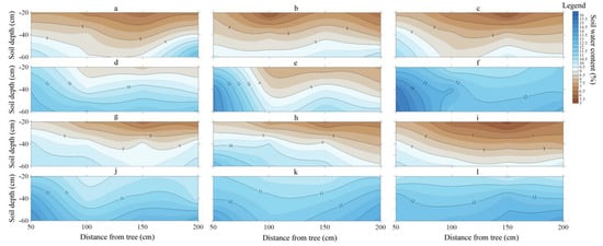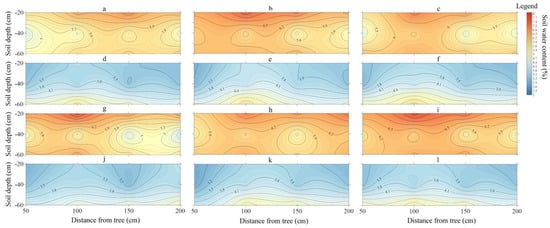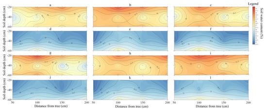 Two−dimensional soil moisture content distribution in different stages of monocropping apple and ryegrass apple intercropping system ((a,d,g,j): flowering and fruiting period; (b,e,h,k): fruit enlarging period; (c,f,i,l): fruit maturing period; monocropping apple (first and third rows) and ryegrass apple intercropping system (second and fourth rows); in the 2020 (top two rows) and 2021 (bottom two rows) seasons).