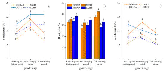 Schematic diagram of temperature, humidness, and wind speed changes in different stages of monocropping apple and ryegrass apple intercropping system. ((A): temperature; (B): humidness; (C): wind speed, Different lowercase letters in the graph indicates significant differences across treatments (p < 0.05).).