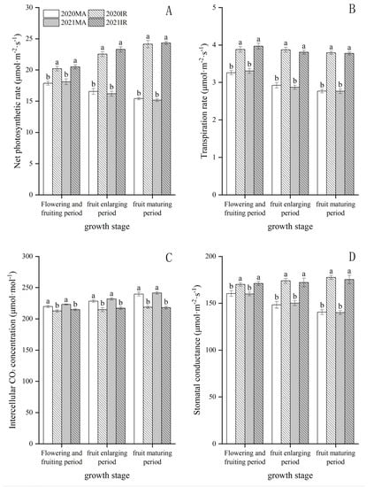 Plant photosynthesis is a complex physiological and biochemical reaction influenced by several environmental factors, such as light intensity, temperature, and water. As shown in Figure 6, “the measuring parameters” Pn, Tr, Ci, and Gs of intercropped apples were significantly different from those of monocropped apples. As apple fertility progressed, the Pn, Tr, and Gs of intercropped apples were greater than those of monocropped apples, reaching the maximum at fruit maturity, which increased by 13.18%, 40.04%, and 58.7% (Figure 6A); 19.62%, 32.59%, and 36.86% (Figure 6B); 6.51%, 16.01%, and 25.78% (Figure 6D). The Ci of intercropped apples was less than that under monocropping and reached the minimum value at fruit ripening, which decreased by 3.43%, 6.17%, and 9.26% (Figure 6C). Intercropping increased Pn, Tr, and Gs and decreased Ci because intercropping reduced the orchard temperature, increased humidity, and reduced the “lunch break” phenomenon of apple leaves. In addition, due to the local dusty weather, the lack of forage mulching between the rows of monocropped apples, and the high amount of bare land blown by the wind, there was more sand and dust on the surface of the apple leaves, which blocked the stomata and reduced the transpiration rate of the apple leaves. Intercropping had no significant interannual effect on the photosynthesis of the apple leaves.