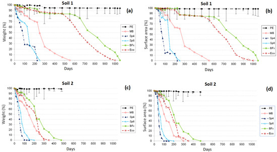 The initial weights of all the materials tested were in the range 0.111 (BFx) to 0.130 (Sp6) grams per 8 × 8 cm2 of surface area. However, from the first sampling date (15 days), significant differences both in weight and in surface area were established among materials in both soils, as shown in Figure 1 (values expressed as percentage in relation to the initial values: new materials, 0 days). Thus, the evolution of the weight and surface area of the materials in each soil was broadly similar. From 50 days in Soil 1 (Figure 1a,b), Sp4 and Sp6 stood out as the most degraded, a circumstance that was maintained until their total disappearance (at 225 days in Sp4 and 250 days in Sp6). Similar behavior was observed in Soil 2 (Figure 1c,d), although in this case the total degradation of these materials occurred somewhat earlier (at 150 days in Sp4 and 200 days in Sp6). MB totally disappeared at 550 days in Soil 1 and at 300 days in Soil 2. As expected, PE remained practically intact in both soils, while the PLA-based materials (BFx and Eco) showed intermediate behaviors; thus, Eco completely disappeared at 1000 days in Soil 1 and at 350 days in Soil 2, while visible remnants of BFx remained up to 1050 and 475 days in Soils 1 and 2, respectively.