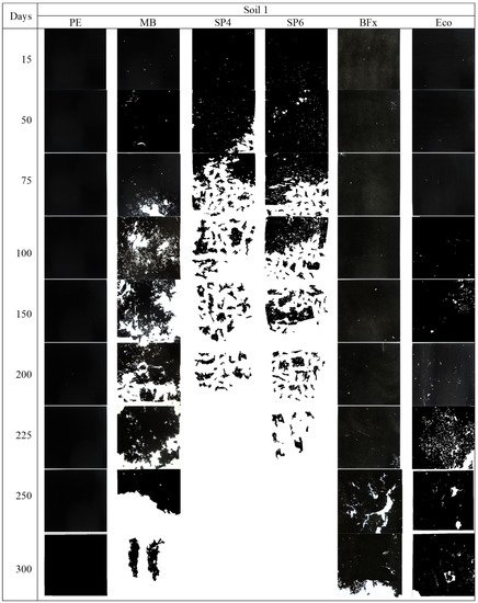 In the field study previously carried out in Soil 1 by Moreno et al. [24], a similar trend was also observed in the degradation of the buried part of the tested mulch materials according to their nature (starch > PLA > PE) at the end of the crop cycle (145 days after transplanting). Although that timeframe (145 days) was not enough to achieve a significant deterioration of the buried part of the PLA mulches in the field (~10% as average), the starch-based materials did show it, especially Sp4 and MB (~40%), although this was not as pronounced as under laboratory conditions, in agreement with previous works [33].