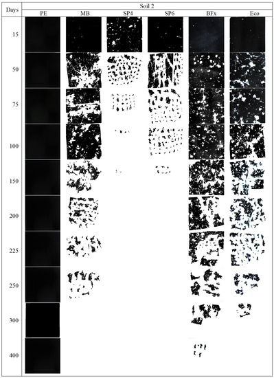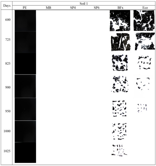 In the comparison of soils, with the exception of PE (which remained practically intact in both), the loss of weight and surface area of the materials was more pronounced in Soil 2 than in Soil 1 (therefore, degradation in Soil 2 was faster). This may have been a consequence of the larger soil–material contact surface in soils with a greater clay component (Soil 2), since the enzymatic activity (ADH) was similar at the beginning of the experiment in both soils. Regarding the materials, in general the degradation depended on their nature, being faster in those based on starch (especially potato (Sp4 and Sp6) compared with corn (MB)) than in PLA compounds (BFx and Eco).