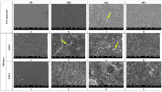 SEM micrographs corresponding to PE, MB, Sp6, and BFx in new materials and after 100 days in Soils 1 and 2 (1000× magnification). The yellow arrows point out different cracks, holes or granules in the materials.