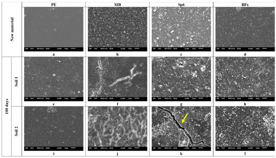 Microphotographs of PE, MB, Sp6, and BFx taken by SEM in new materials and after 100 days in Soils 1 and 2 (500 and 1000 magnifications, Figure 4 and Figure 5, respectively) showed that the surface of the new materials was smooth, without cracks or roughness. PE presented a very homogeneous surface due to the uniformity of the mixture of the granules it is made from. The surface of the BD materials revealed a fairly uniform dispersal of the starch particles for MB and Sp6, and of polylactic acid for BFx. These particles are embedded in a continuous matrix made up of the synthetic polymeric component used for the formulation [1]. At 100 days, a greater degree of degradation of the materials (except for PE, which remains intact) was observed, with differences between the two soils clearly visible. Thus, MB in Soil 2 presented a greater number of cracks than in Soil 1, although they were very uniformly distributed across the surface (Figure 4f and Figure 5f). Sp6 in both soils presented larger whitish granules in comparison with new material, which could be caused by the swelling of the starch particles due to the effect of humidity. Likewise, in Soil 1 (Figure 4g), some holes of a similar size to those of the original starch particles can be observed (see arrows on the figure). This finding could be explained by the fact that, when biodegradable mulch films are in contact with the soil, the microorganisms present feed on the original starch particles [33,41]. In Soil 2, a greater roughness was observed, probably due to a higher concentration of starch particles in these areas. It is worth noting the shape of the cracks in this material, in which distortion of the filaments is observed when the material is degrading (Figure 4k and Figure 5k). In BFx there were no clear signs of degradation (no cracks or holes); however, at 100 days, the granules observed in the new material became smaller in Soil 2 than in Soil 1 (Figure 4d,h,l and Figure 5d,h,l).