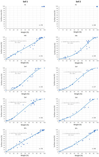 where y represents the surface area, x the weight (percentage values) and α, β, γ, the corresponding parameters of the model (see equations for the sigmoid curves in Figure 6). The small plateau of points in the sigmoid curves (on the right side of most of the figures, especially pronounced in Sp4 and Sp6) corresponds to the first stages of degradation. At this stage there was a reduction in the weight of the materials as a result of a decrease in their thickness (refining), but there was as yet no breaking (no cracks or holes), thus keeping their surface areas practically intact. As an example, we can see that the breaking threshold for the surface considered (8 × 8 cm2) would be reached when the weight dropped to 80% in Sp6 in Soil 2 or to 90% in PLA materials in Soil 1. In the case of PE, however, there was only a slight variation in the weight of the samples in both soils, although the surface area remained intact.