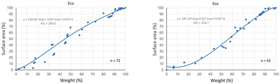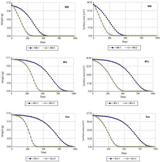 As in the exponential case for Sp4 and Sp6, the Gompertz models for the weight and surface area of MB, BFx,h and Eco also showed great similarity to each other, and the degradation curves relative to Soil 2 were always below those corresponding to Soil 1. This indicates that the (negative) growth rate is higher in Soil 2 than in Soil 1 (parameter γ and the slopes of the curves more negative in Soil 2) (Figure 8, Table 4). This is especially noteworthy in Eco, with total disappearance in Soil 2 around 350 days compared with 1000 days in Soil 1.