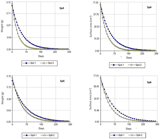 Both in Sp4 and Sp6, the curves of the exponential degradation models relative to weight and surface area in Soils 1 and 2 were similar to each other (Figure 7): in both materials, the curve relative to Soil 2 always appeared below that corresponding to Soil 1, which shows a faster decrease in weight and surface area over time in Soil 2, as they are curves with a steeper slope (b values more negative in Soil 2, Table 3).