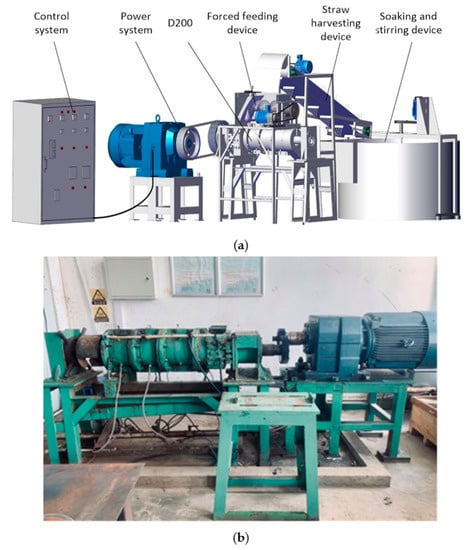 D200 single screw straw-based fiber extruder ((a): schematic diagram; (b): physical drawing).