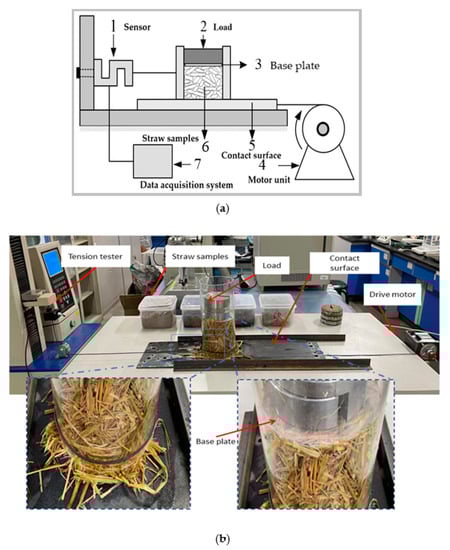 The measuring device is shown in Figure 2a. The test scene is shown in Figure 2b. When testing, a sample box with a diameter of 160 mm connected to a load cell was placed on a friction surface and filled with the straws. The straw was placed randomly. The desired load was applied to the base plate at top of the straw samples and kept there for 30 s. The friction surface was horizontally moved by a driving unit at a constant velocity of 24 mm/min. It should be noticed that the sample box could not contact the surface so as not to affect the accuracy of the measurement data. The friction force was sensed by a load cell connected to the sample box, and the data were recorded on a PC through a data acquisition system. Those data that changed steadily in a certain period were accepted, and data that fluctuated greatly were excluded. For each replication, the samples were emptied and refilled with a different sample. For the friction tests, were conducted in three replicates were used.