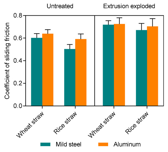 As seen in Figure 3, the coefficient of sliding friction of extrusion-exploded straw was significantly higher than that of untreated straw for both wheat and rice straw on both mild steel and aluminum surfaces. The different letters in Table 7 show significant variation. This phenomenon may be due to the fact that the fibrous external surface of extrusion-exploded straw was rougher compared to that of untreated straw. Additionally, it is possible that, for extrusion-exploded straw, the amount of straw forced to contact the surface increased; in other words, closer contact existed when a normal load was applied. Consequently, this increased the contacting surface area, and then the sliding friction force increased. This could be due to the fact that the structure of straw became looser and more flexible as a result of the removal of partial lignin and hemicellulose, reductions in crystallinity and polymerization, and an increase in porosity through the extrusion process [26].