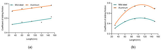 As shown in Figure 4, for the coefficient of sliding friction of untreated wheat straw, a predominantly linear upward trend was noted from a minimum value of 0.457 to a maximum value of 0.510 on mild steel and from 0.548 to 0.590 on aluminum when the length was in the ascending range from 30 to 150 mm. The multiple comparison results indicated that the difference in the coefficient of sliding friction was significant between two adjacent length intervals, with a few exceptions.