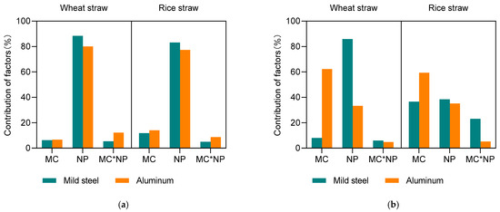 Contribution of factors to coefficient of sliding friction ((a): untreated straw; (b): extrusion-exploded straw).