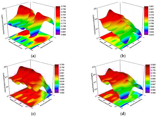 Figure 5a,b shows the effects of the moisture content and normal pressure on the coefficient of sliding friction of untreated straw. At any level of moisture content, the coefficient of sliding friction was shown to first decrease with an increase in normal pressure from 2 to 4 kPa and then increase sharply when the normal pressure increased from 4 to 6 kPa before finally decreasing gradually as the normal pressure continued to increase from 6 to 10 kPa. The highest coefficient of sliding friction value was found at a normal pressure of 6 kPa, and the lowest value was found at a normal pressure of 2 or 4 kPa. It is commonly found that an increase in the normal pressure leads to a decrease in the wall friction coefficient [17,18]. The data points recorded in this study showed a different trend compared with those presented in the literature mentioned above. This may be related to the contact surface moving too fast.